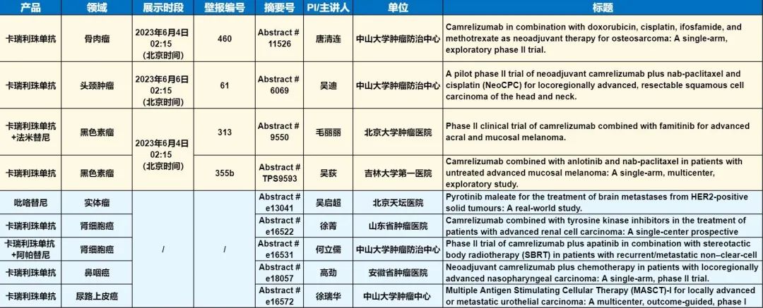 此外,在头颈肿瘤、黑色素瘤、骨肉瘤、鼻咽癌、肾细胞癌、尿路上皮癌等多个领域,卡瑞利珠单抗、吡咯替尼等产品相关研究一共入选了4项壁报展示和5项线上发表,彰显了BBIN宝盈医药强大的自主研发综合实力。